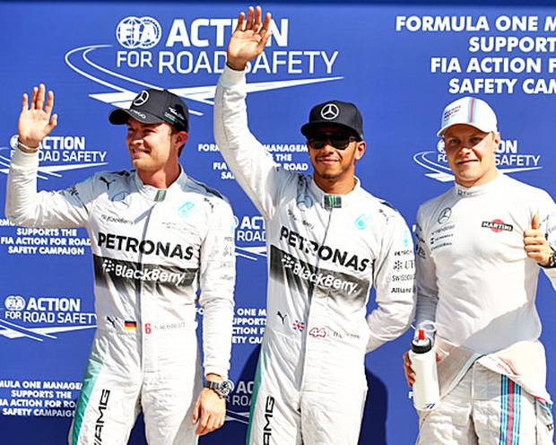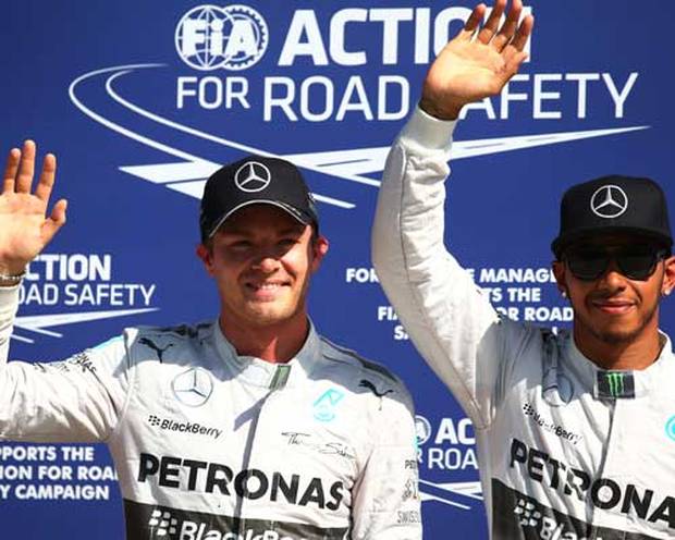 Mit Hamilton steht der bessere Starter auf der Pole-Position, Rosberg muss sich in der Startaufstellung schrägt versetzt hinter seinem Teamkollegen einreihen.