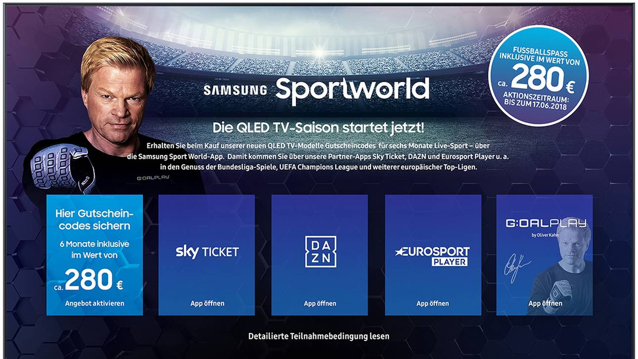 Mit der Sportworld App auf den neuen Samsung QLED TVs haben Fußballfans ab sofort ganz einfachen Zugang zu den Streaming-Angeboten von Sky Ticket, DAZN und Eurosport Player.