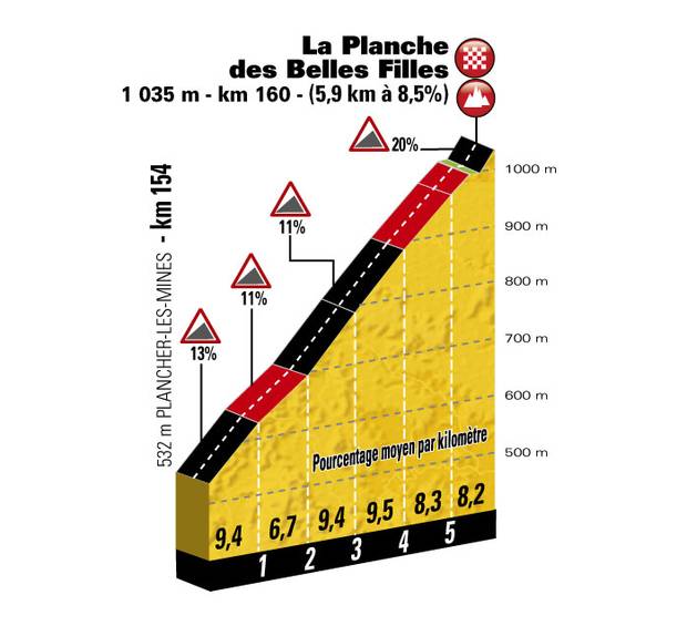 So wartet zum Beispiel beim Aufstieg zur Planche des Belles Filles eine Rampe mit 20 Prozent auf das Peloton.
